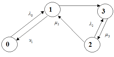 А) построить граф переходов между состояниями, ребра которого помечены соответствующими интенсивностями переходов.