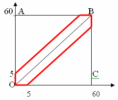 Тогда вероятность встречи равна отношению площадей области $G$ и квадрата, то есть $$P(A)=\frac{S_G}{S_{OABC}}=\frac{60\cdot 60-55\cdot 55}{60\cdot 60}=\frac{23}{144}=0,16.$$