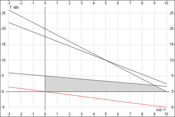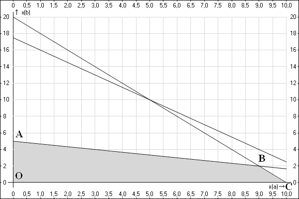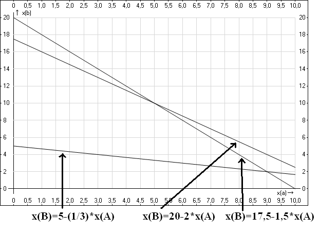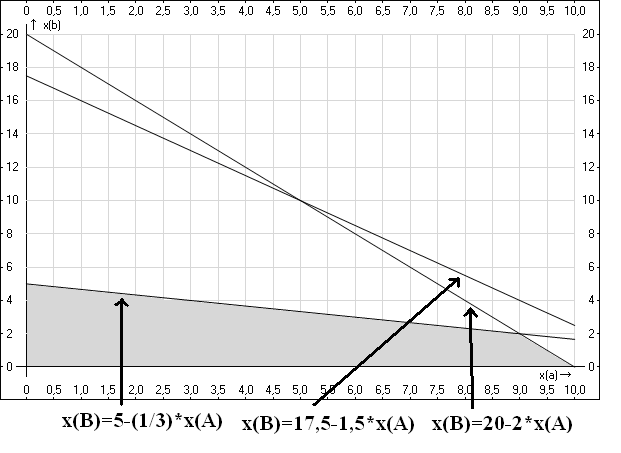 Эта область, во-первых, расположена в первой четверти, как и должно быть, во-вторых, левее и ниже прямых $x_B=5-\frac{1}{3}x_A$ и $x_B=20-2x_A$. Прямая $x_B=17,5-1,5x_A$ оказалась не участвующей в решении, так иногда бывает, это не страшно.