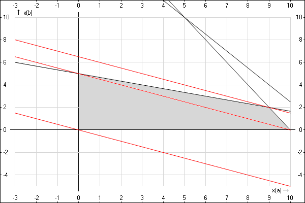 Что будет, если эту линию поднимать выше (параллельным переносом)? Мы получим линии, которые будут давать больший, чем 0 доход. Получается, чем выше мы поднимем данную линию, тем лучше. Однако совсем до бесконечности поднимать ее не получится, ведь она должна хотя бы касаться разрешенной области, обозначенной серым цветом (сейчас она касается только в точке (0,0)). Попробуем провести (пока на глаз) линии, параллельные данной, через оставшиеся три точки многоугольника: