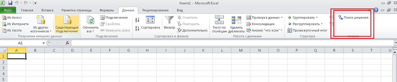 Итак, запустим Microsoft Excel, и перейдем на вкладку "Данные". Справа должна располагаться кнопка "Поиск решения", как на картинке: