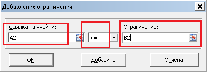 То есть, говорим, что значение ячейки A2 (первое ограничение) должно быть "меньше или равно" значению ячейки B2 (правой части первого ограничения). Нажимаем OK, и ограничение добавится в список. Таким же образом добавляем два других ограничения, а также еще три ограничения - что наши переменные должны быть больше или равны нулю. Должно получиться следующее: