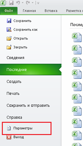 Если же этой кнопки нет, то необходимо включить соответствующую надстройку. Для этого откроем меню файл, и выберем пункт "Параметры":