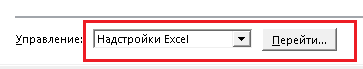 Затем в правой части, внизу, необходимо выбрать из выпадающего списка "Надстройки Excel", если они еще не выбраны, и нажать кнопку "Перейти":