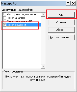 Появится следующее окно, в котором необходимо отметить галочкой необходимую надстройку (Поиск решения), и нажать кнопку "ОК". После этого на вкладке Данные, в правой части должна появиться показанная выше кнопка
