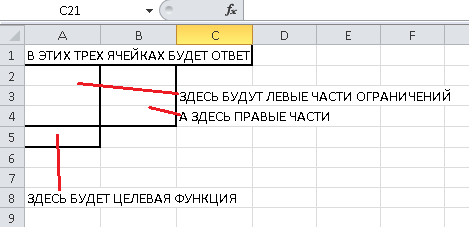 Итак, начнем заполнение. В верхние три ячейки нужно занести ответ, то есть, количество производимых изделий A, B и C. Так как ответ мы не знаем (а иначе зачем бы мы задачу решали), то пока занесем туда три нуля: