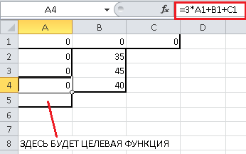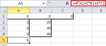 Точно так же, в ячейку A5 занесем формулу для целевой функции $F({x_A},{x_B},{x_C}) = 4{x_A} + 5{x_B} + 6{x_C}$ - в Excel это будет формула "=4*A1+5*B1+6*C1". Точно так же, не обращаем внимания, что результатом будет 0 - это естественно, ведь целевая функция представляет из себя прибыль предприятия, а раз мы ничего не производим, то естественно, получаем нулевую прибыль: