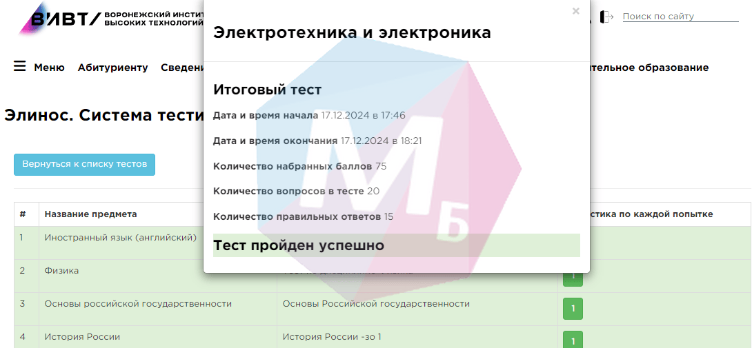 Желательно прислать: ссылку на сайт вуза, названия тестов/предметов (можно скриншотом), число вопросов в тесте, количество попыток, желаемый балл и сроки. Чем точнее информация, тем быстрее оценка и сдача.