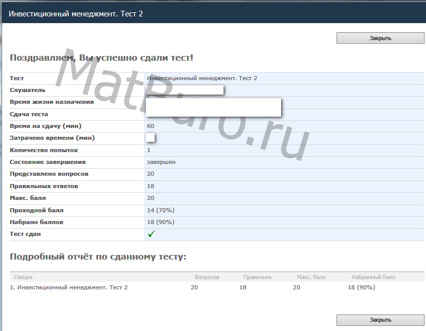 - Марина Работа выполнена в день оформления заявки: быстро, качественно и на высоком уровне.Тест сдан досрочно. Результат - отлично. Обращайтесь за помощью в "MatBuro" - не пожалеете. Побольше бы таких грамотных специалистов.С глубоким уважением, Марина.