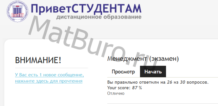 МатБюро окажет консультацию по сдаче дистанционных тестов по различным разделам менеджмента для студентов. Вы сможете сдать тренировочные и итоговые тесты, дистанционные экзамены и успешно закрыть сессию.