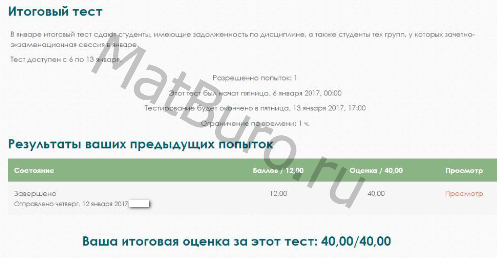 Желательно прислать: ссылку на сайт вуза, названия тестов/предметов (можно скриншотом), число вопросов в тесте, количество попыток, желаемый балл и сроки. Чем точнее информация, тем быстрее оценка и сдача.