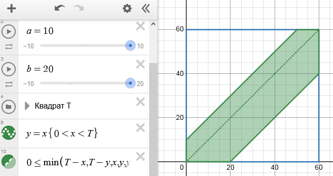 $$ P(A)=1-\frac{(T-a)^2}{2T^2}-\frac{(T-b)^2}{2T^2}; \quad P(B)=1-P(A)=\frac{(T-a)^2}{2T^2}+\frac{(T-b)^2}{2T^2} (***) $$Онлайн-чертеж для задачи о встречах