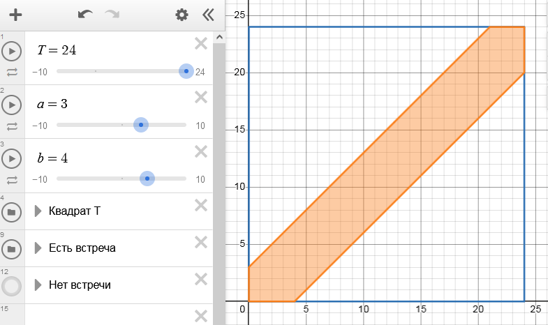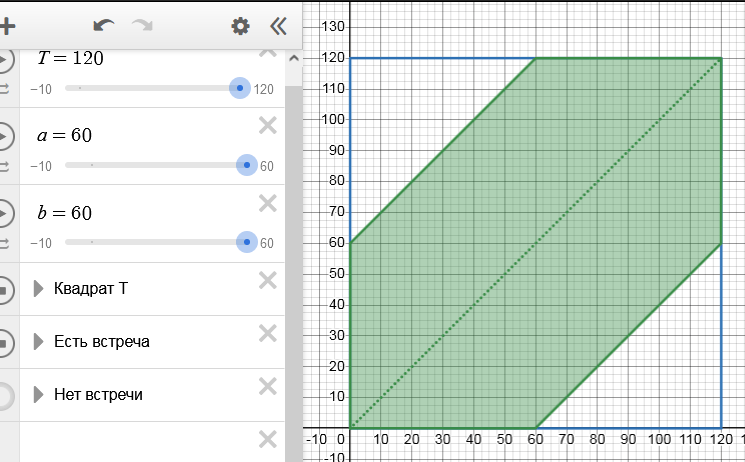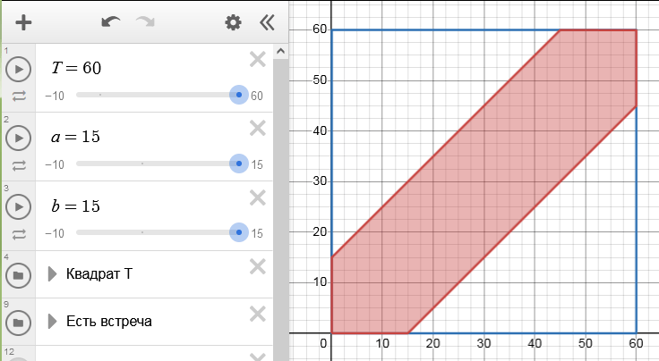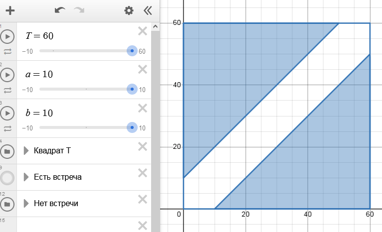 По ссылке вы найдете шаблон чертежа для задачи о встречах в Desmos, где можно ввести свои параметры из задачи (интервал прихода $T$, время ожидания $a$, $b$) и получить рисунок именно для вашего случая: Задача о встрече