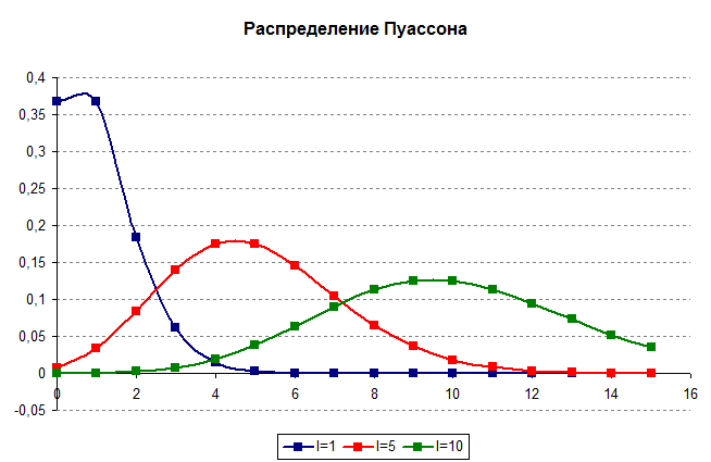 График распределения ведет себя по-разному, в зависимости от параметра: при малых \( \lambda \) оно сильно асимметрично (см. синий график, \( \lambda=1 \)), при возрастающих значения \( \lambda \) приближается к нормальному (см. зеленый график, при \( \lambda=10 \) уже имеет характерный вид "колокола").